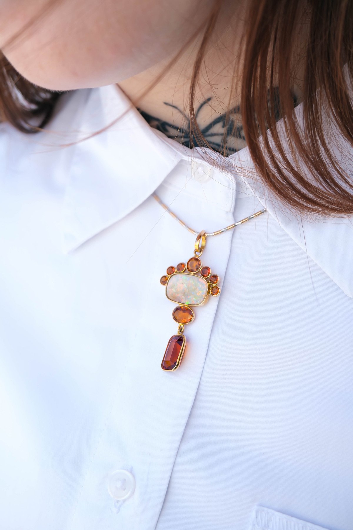The Aurora Empress pendant is a radiant fusion of elegance and mystique. Handcrafted to capture the glow of celestial light, the Aurora Empress makes a bold yet graceful statement. Whether worn alone or layered, the Aurora Empress pendant adds a luminous charm to your every day.