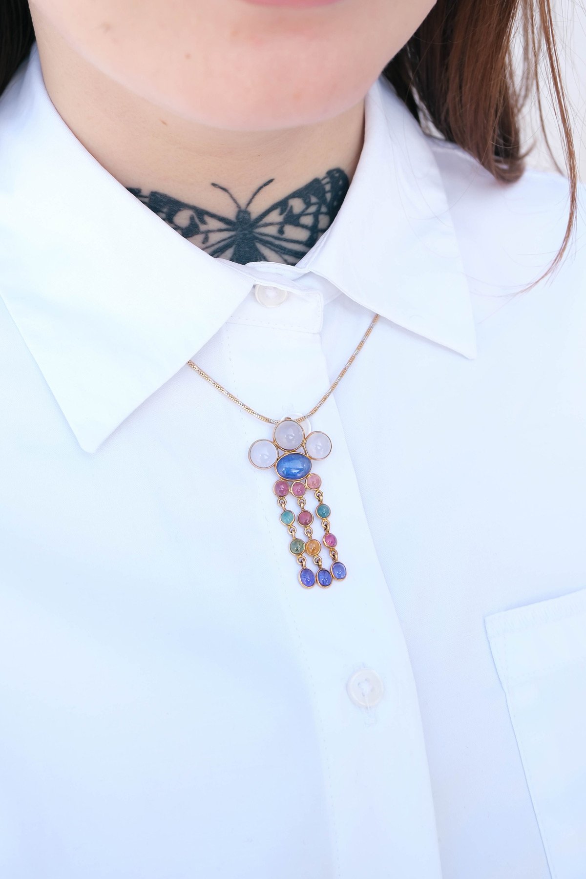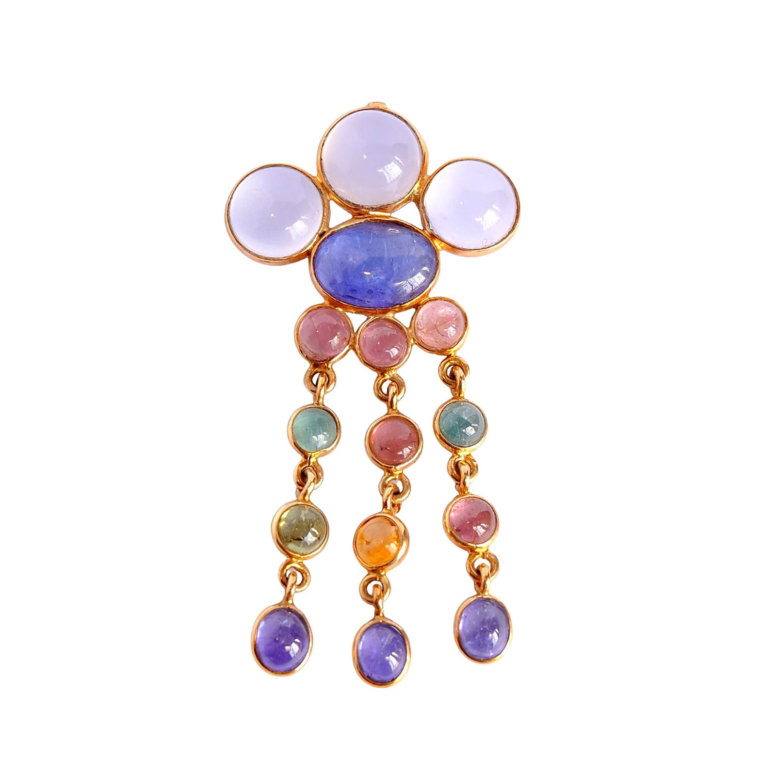 The Rain of Spring Pendant captures the softness of passing clouds and gentle rain, with a chalcedony and tanzanite crown and falling drops of multicolor tourmalines and tanzanite. Crafted in gold, the Rain of Spring Pendant feels fresh and light. Let the Rain of Spring Pendant move with quiet grace.