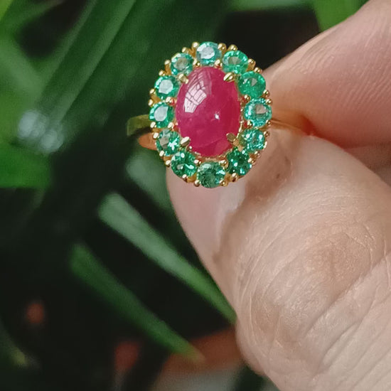 The Forest Ember is a vision of classic elegance and vibrant color. A bloody red natural Ruby is prong-set in 9k gold, framed by Stunning Emerald with its traditional craftsmanship and gemstone harmony, the forest ember Ring is a timeless treasure for your collection.