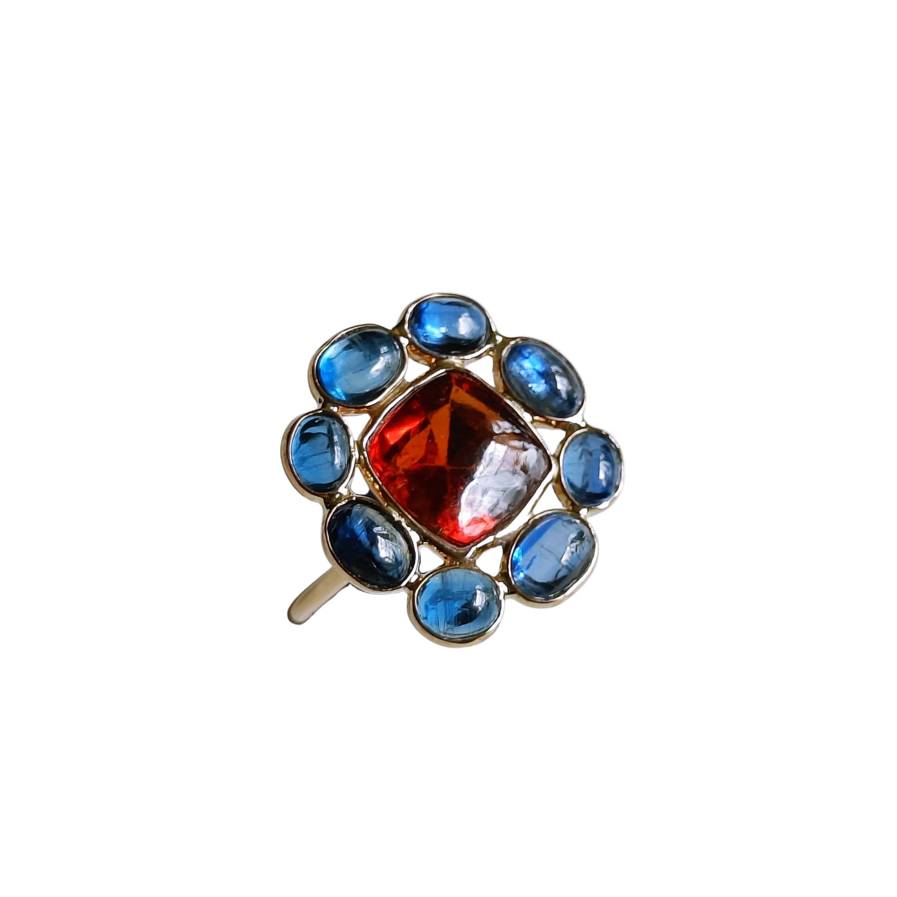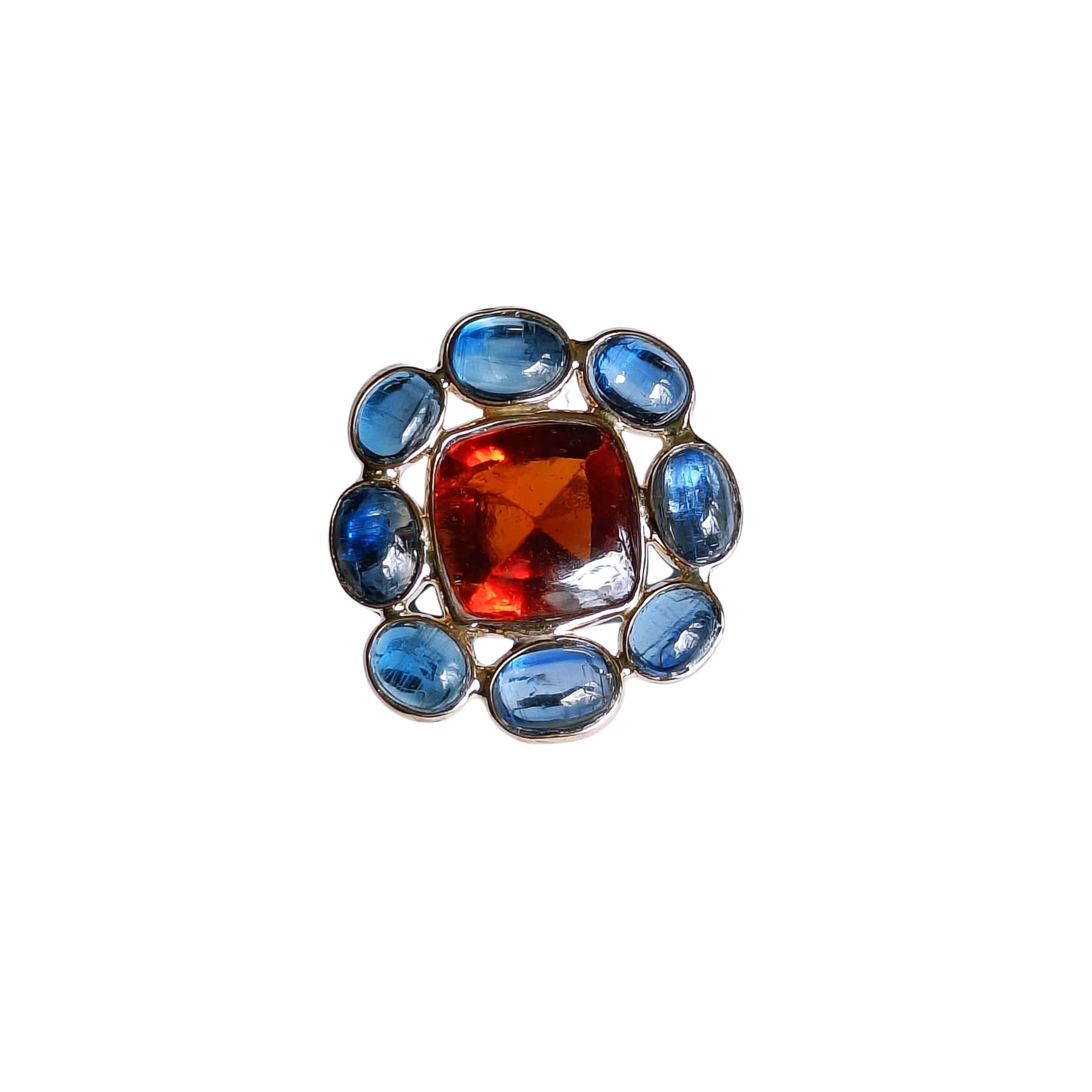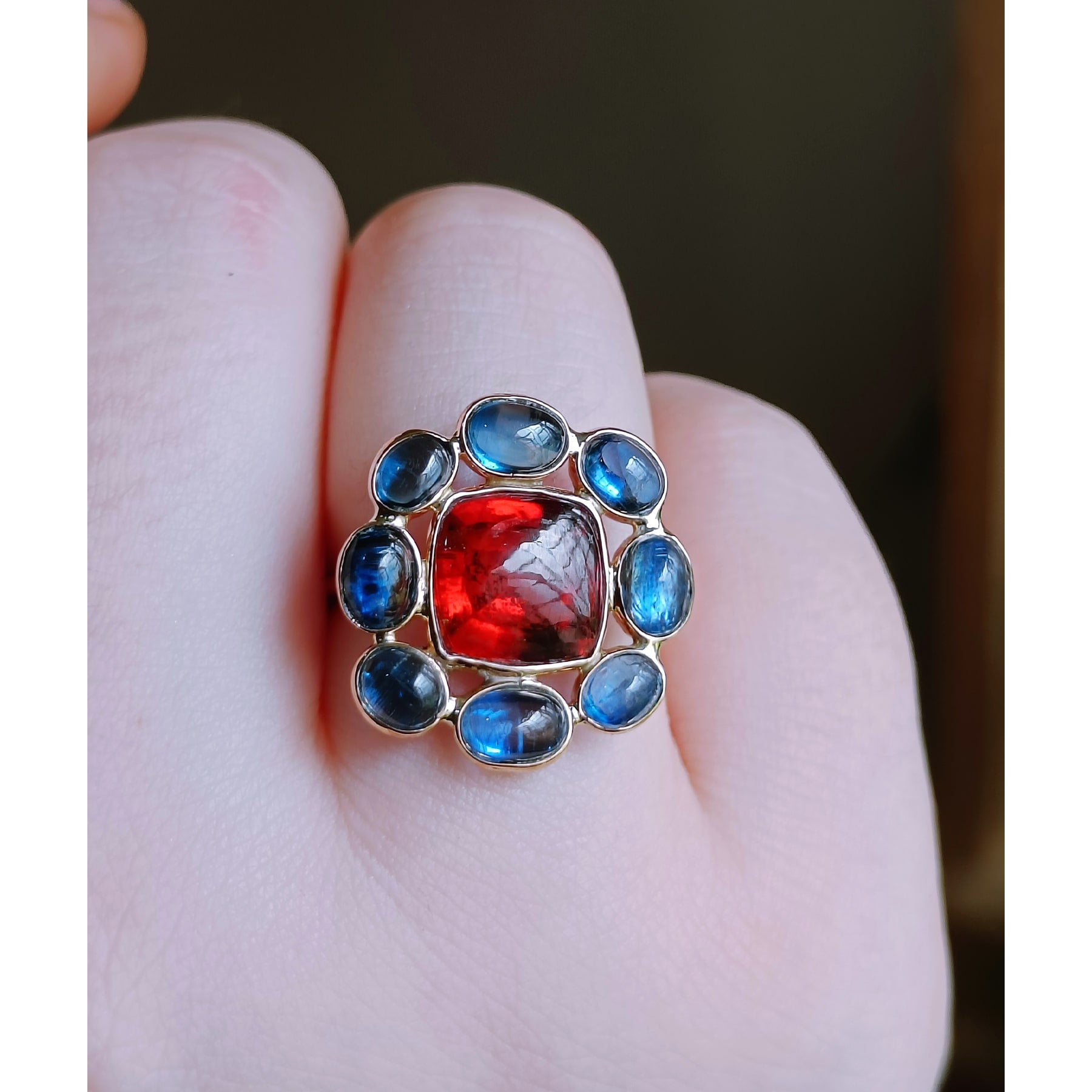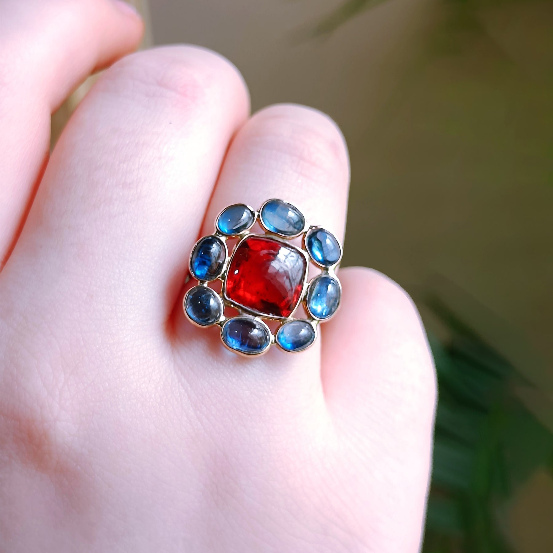 The Sunset & Sea Ring radiates the warmth of a golden horizon meeting the calm of endless waters. Handcrafted in 14k gold and adorned with a cushion-cut hessonite framed by oval cabochons of blue kyanite, the Sunset & Sea Ring glows with striking contrast and timeless beauty. Let the Sunset & Sea Ring carry the magic of fire and sea into your every moment.